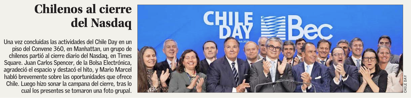 Una vez concluidas las actividades del Chile Day en un piso del Convene 360, en Manhattan, un grupo de chilenos partió al cierre diario del Nasdaq, en Times Square. Juan Carlos Spencer, de la Bolsa Electrónica, agradeció el espacio y destacó el hito, y Mario Marcel habló brevemente sobre las oportunidades que ofrece Chile. Luego hizo sonar la campana del cierre, tras lo cual los presentes se tomaron una foto grupal