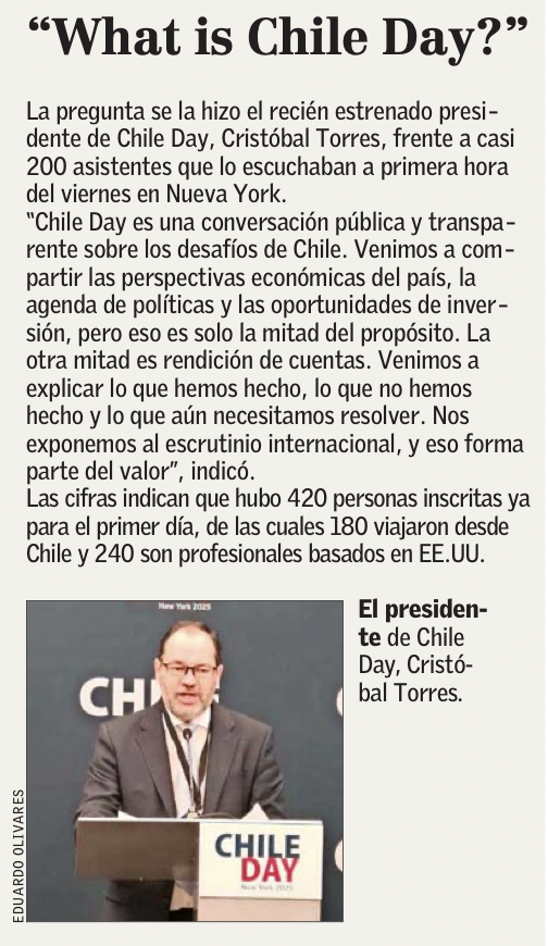 La pregunta se la hizo el recién estrenado presidente de Chile Day, Cristóbal Torres, frente a casi 200 asistentes que lo escucharon a primera hora del viernes en Nueva York.